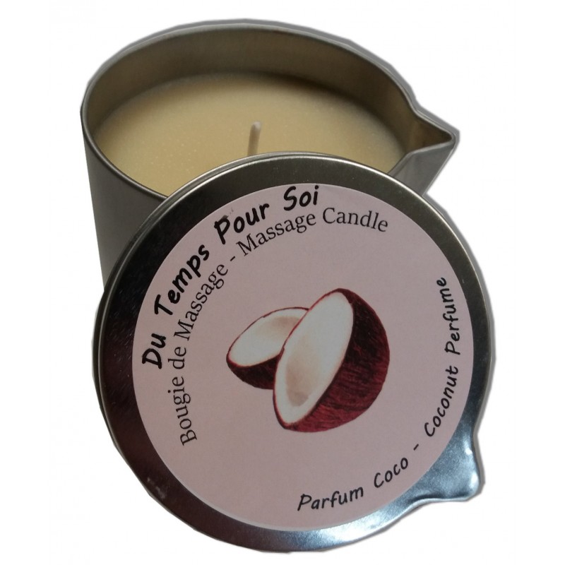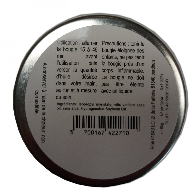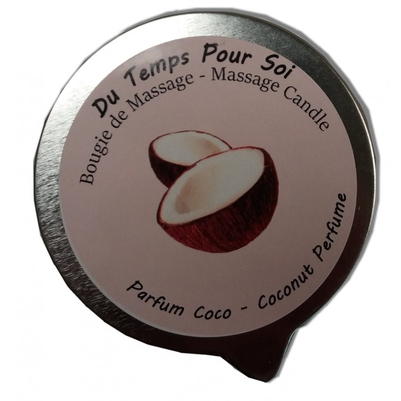 Bougie de massage de 150 grammes au parfum du coco présentée en boite refermable.